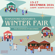 Twelve wooden alpine huts nestled in Stapleford Granary courtyard, selling arts, crafts and festive gifts, creating a magical backdrop to our new Winter Fair. The site is lit with Christmas trees and fairy lights; there’s live music, a forest grotto and craft activities for children; mulled wine, mince pies, pop-up food stalls and much more!