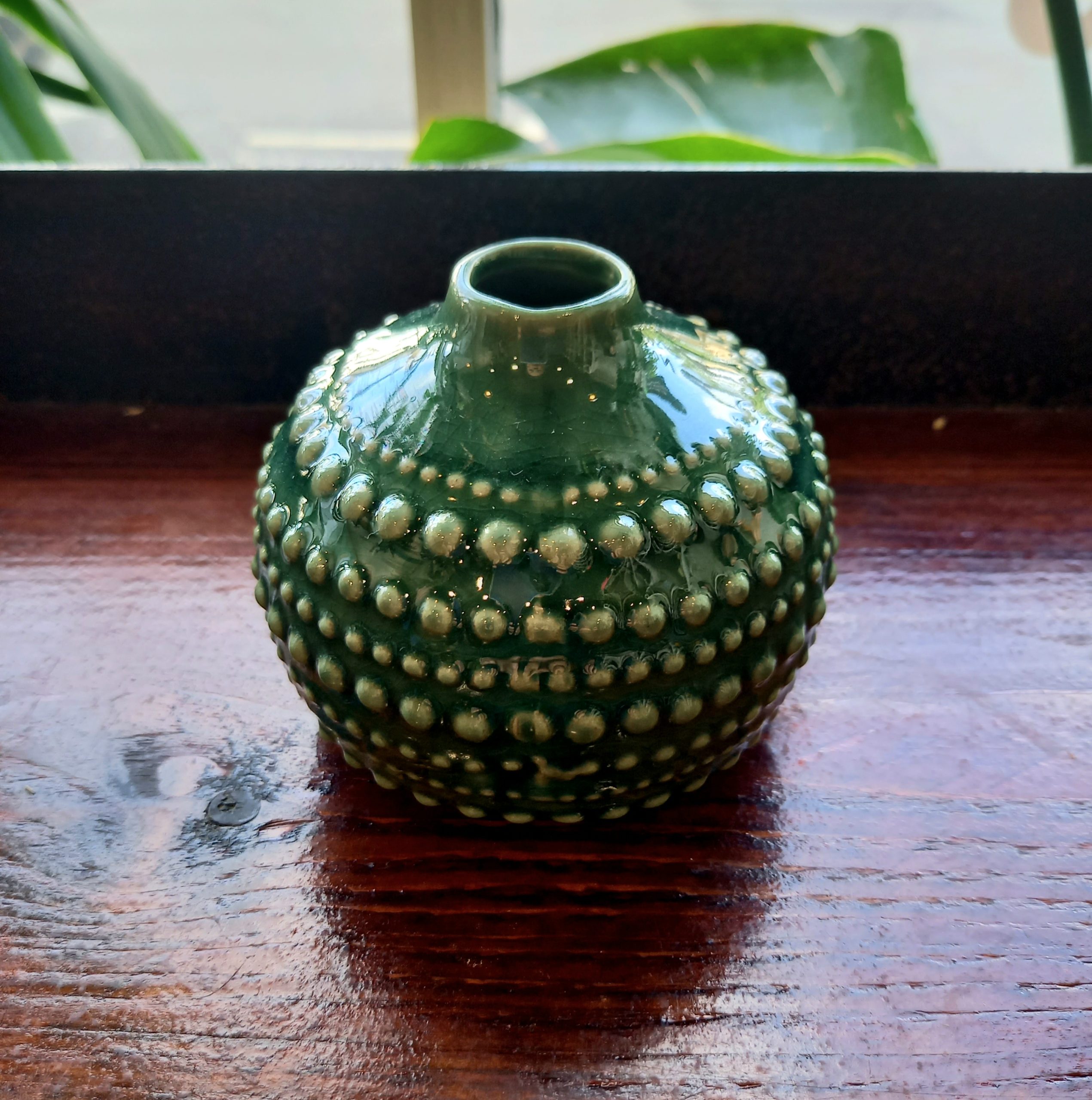 This pretty green vase is perfect for a small posy of either dried or fresh flowers! They are 9cm in diameter at the widest point and 8cm high.