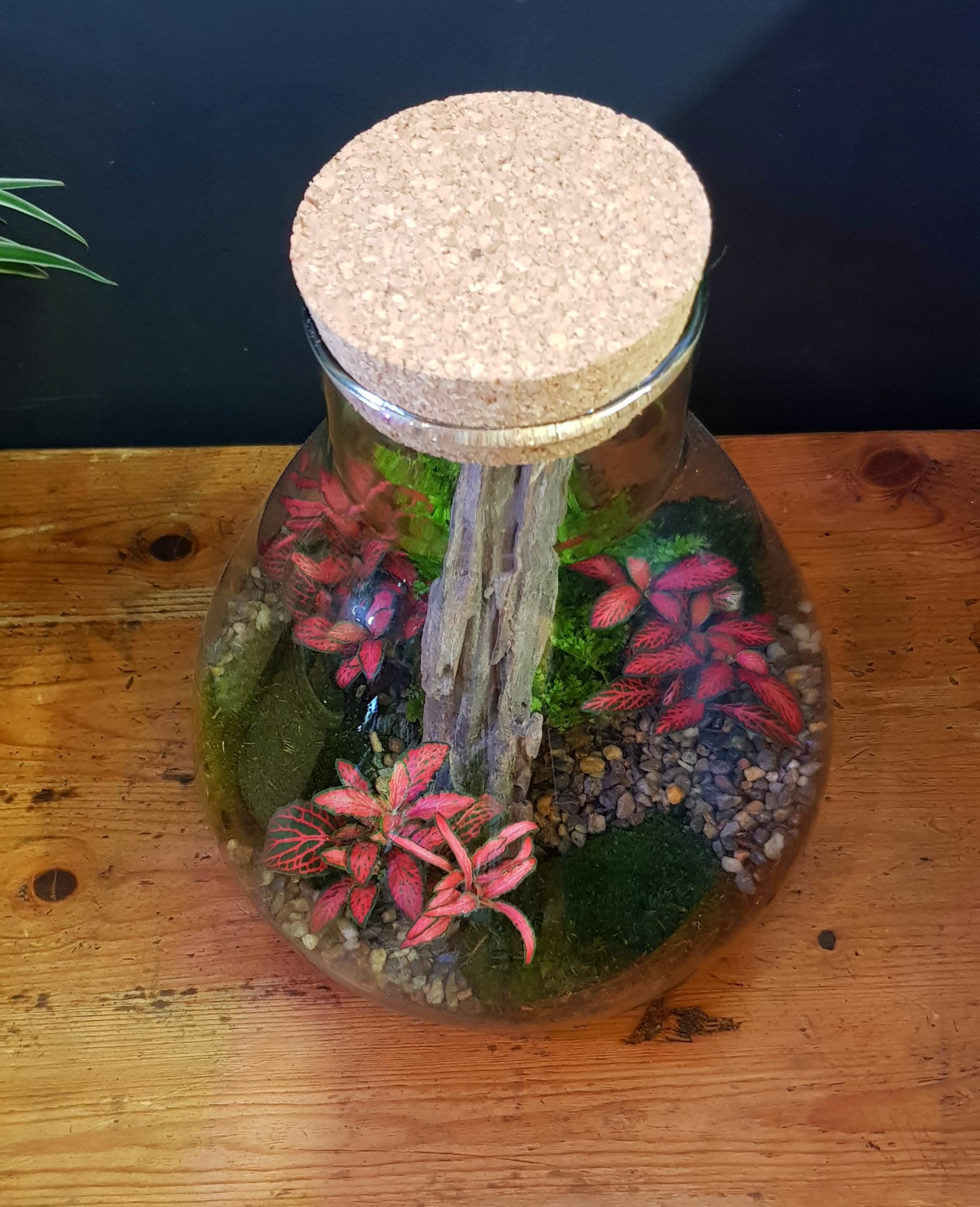 These beautiful conical terrariums are handmade in our shop and are made for recycled glass.  They are approximately 17cm diameter at the base and 20 cm high.  We plant them with a mixture of colourful Fittonias, ferns and cushion moss.  Please note your terrarium might be different from the one in the picture.