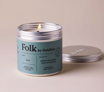Drenched Grass and Petrichor Vegetable Wax candle in a recycled tin, made by FieldDay. The aluminium tin is fully recyclable or can be upcycled to make a tin can garden with flowers or herbs.