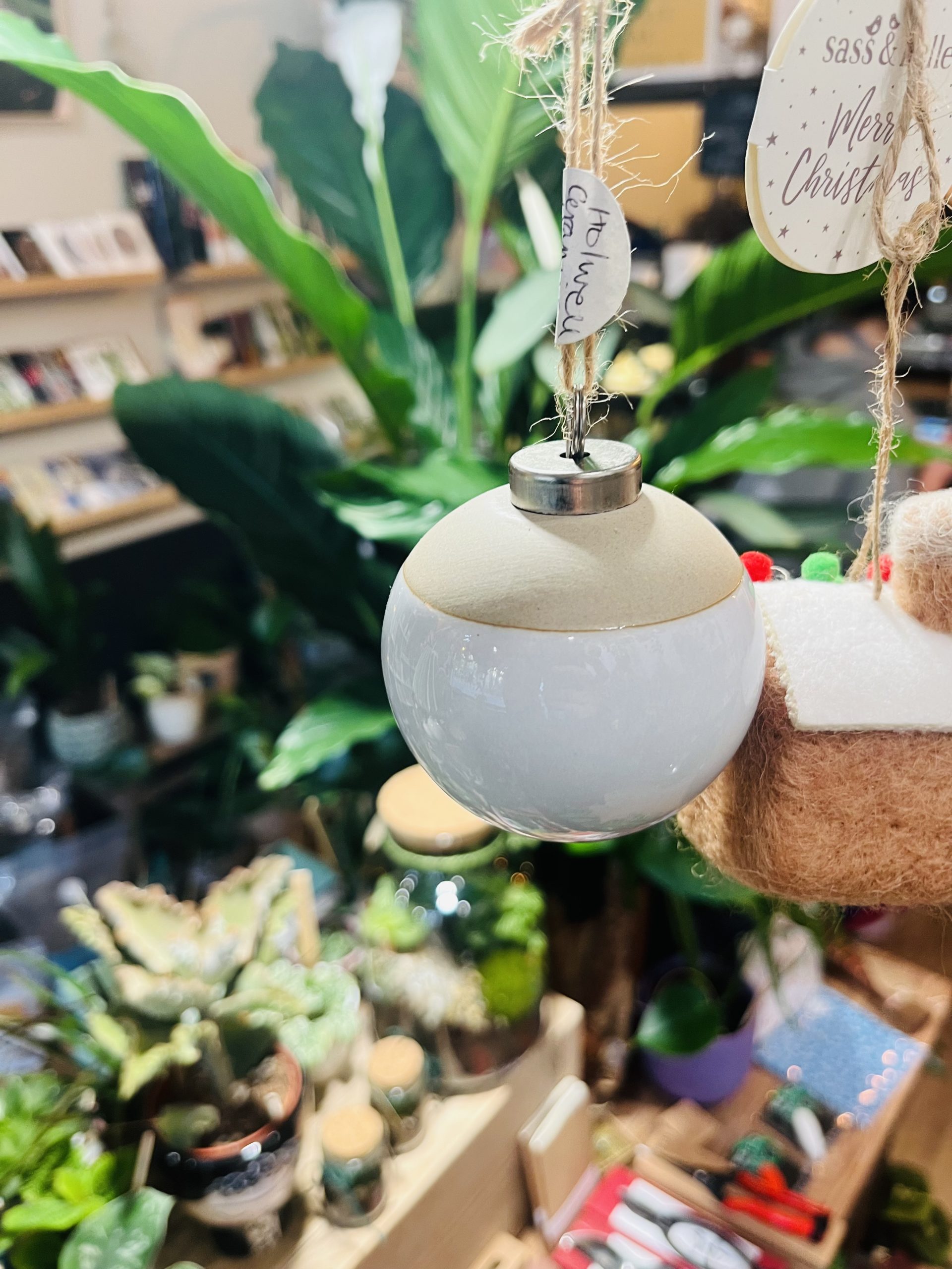 These lovely ceramic baubles are 6cm in diameter and have a beautiful white glaze on the bottom section. They come with their own hanging string.
