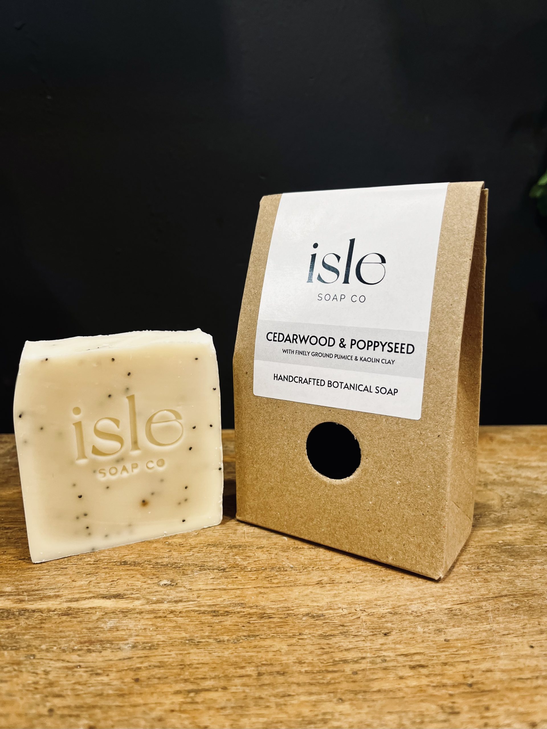 Isle Soaps are a local business with a passion for beautiful scents. This soap is fresh and woodsy, these bars contain poppyseeds and fine pumice for exfoliation.