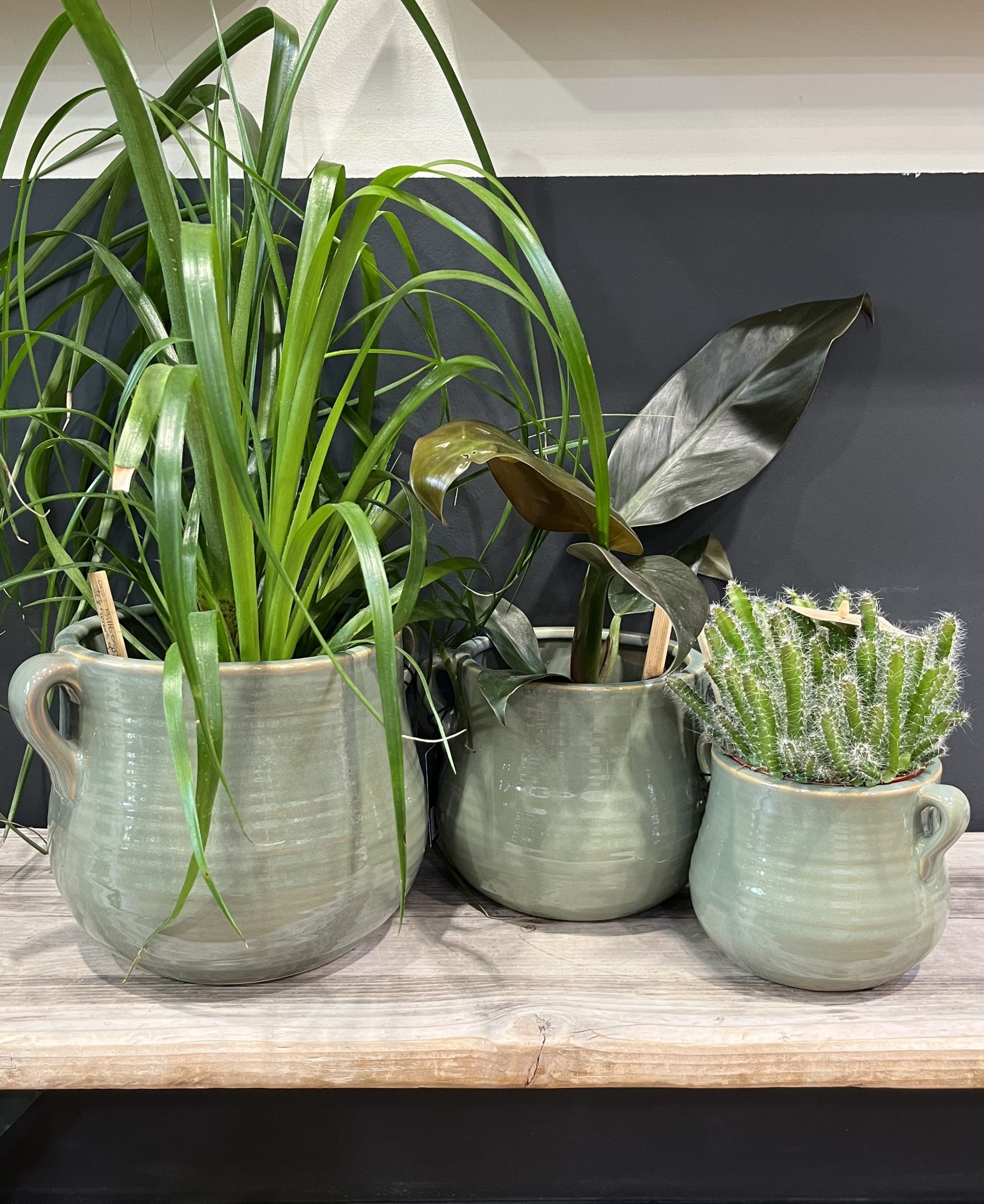 These lovely sage green, handled pots come in three sizes. The largest being 16cm in diameter, the medium 13cm & the small 10cm. These pots are for indoor use only as they have no drainage holes.