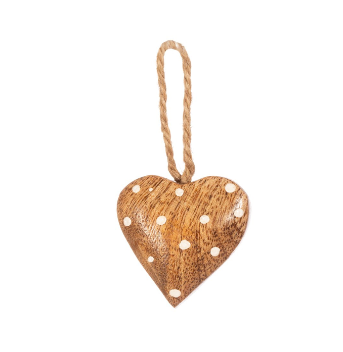 Made from mangowood and complete with a yarn string for hanging. This decoration is shaped as a heart and features a white polka dot print. The mini size is perfect for smaller Christmas trees!
